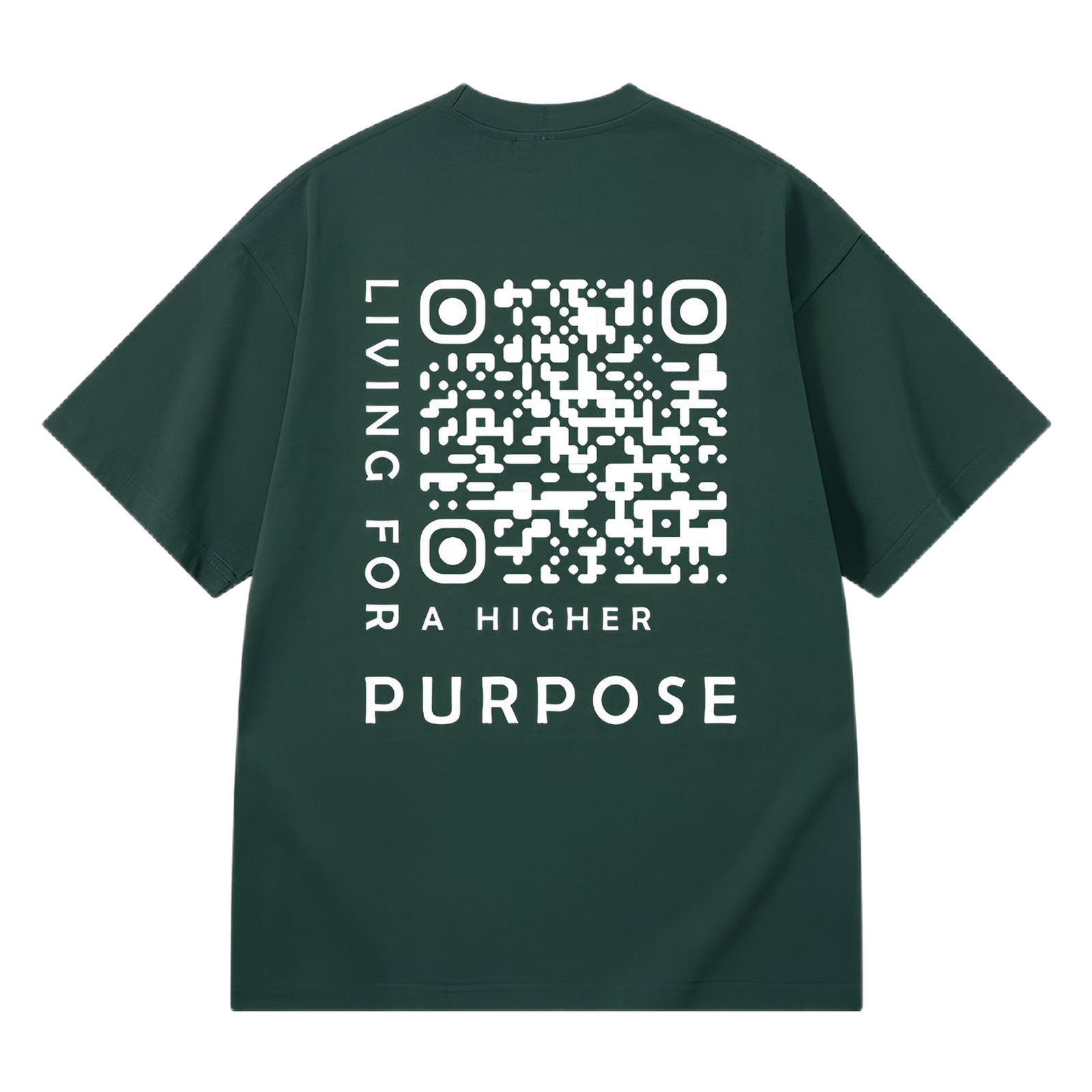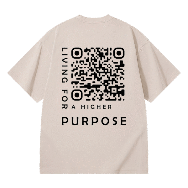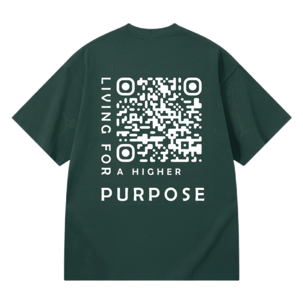 The back features a premium print showcasing a bold QR code encircled by the message “Living for a Higher Purpose.” Scanning the code takes you to a daily Bible verse, creating a wearable evangelism tool that helps spread God’s Word in a new and creative way.